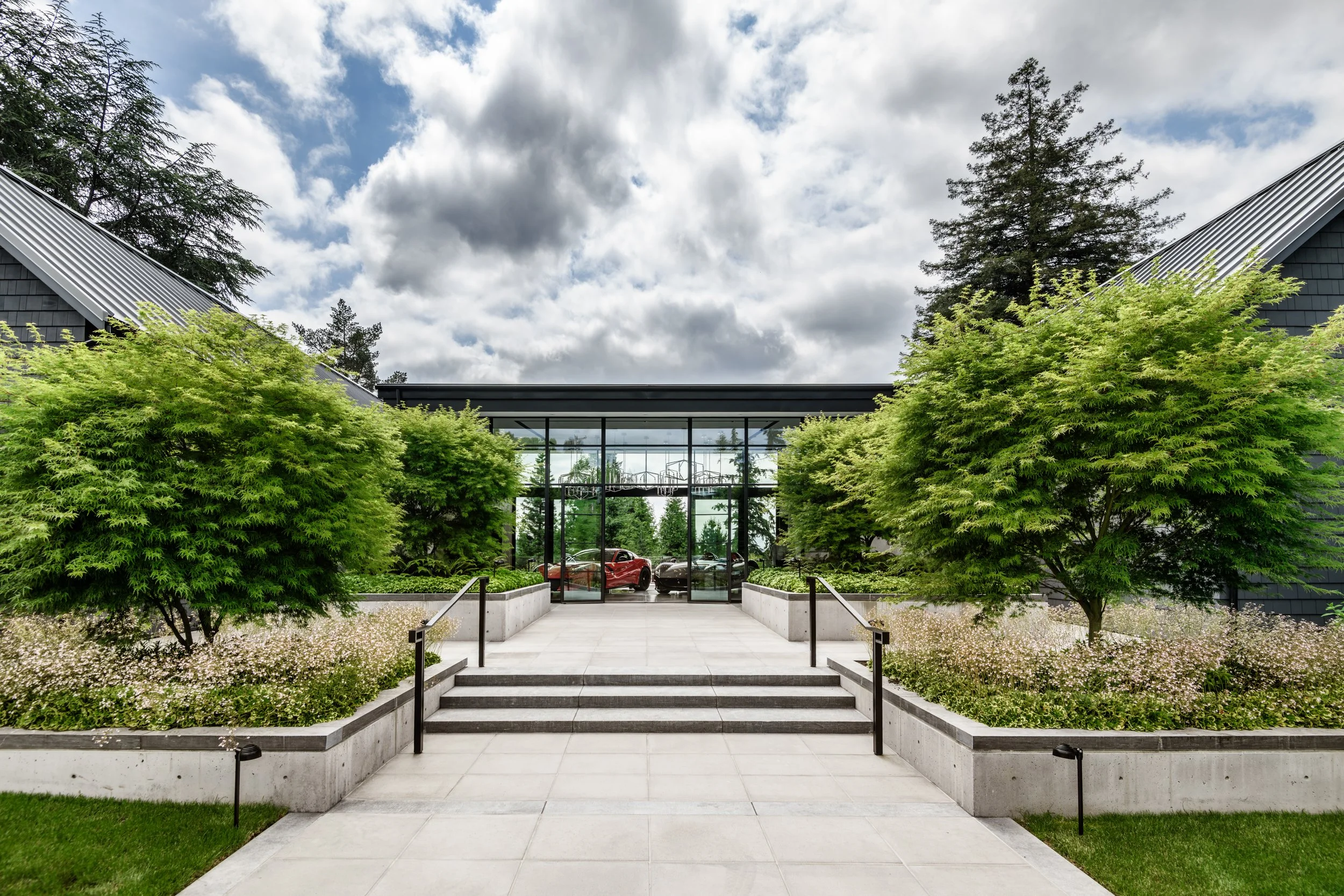 Located in the Seattle region, this one-acre garage pavilion site serves as a venue for nonprofit and private events, incorporates a guest apartment, and houses the owners’ car collection. Set within a residential neighborhood, the building and landscape are carefully scaled to integrate with their surroundings. The site features a series of exterior open spaces designed to support outdoor events, including an expansive drivable lawn, native tree and shrub buffers for screening and softness, and a cascading sequence of bioretention planters. These planters step down across the site, slowing stormwater movement while providing both ecological function and a distinctive landscape feature.